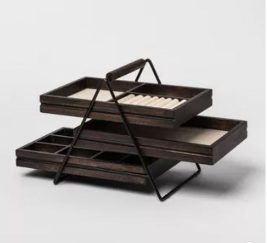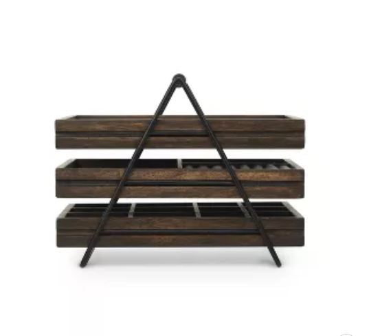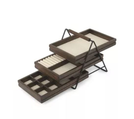 For many of us, our jewelry is often some of our most prized possessions. It's only natural to want to these precious pieces inside beautifully designed storage methods, that will keep them protected and well organized. With this elegant and cleverly designed set of stacked trays from Umbra, the solution (and your jewelry) will be easily on hand. Introducing the Terrace Jewelry Tray by Umbra. The Terrace Jewelry Tray features three stacked trays, each with dividers optimized for organizing jewelry and keeping it safe, thanks to each tray'slinen lining, which is gentle on accessories while keeping them in place. Made of high-quality, Paulownia wood with an elegant, walnut finish, and a black metal wire frame for stacking its trays, Terrace is a piece you will be proud to leave out in your home. A beautiful, beige linen lines each of its exposed trays. Details: This piece makes excellent use of vertical space, stacking the trays, freeing up space on your vanity or counter, while adding a nice decorative dimension of height and beautiful material to any vignette in your home. It measures 7 x 10 x 8 inches (17.8 x 25.4 x 20.3 cm). For a clever and elegant-looking method for storing your jewelry, order Terrace today. About Umbra: A global product design company providing original, modern, casual, and functional design for the home.