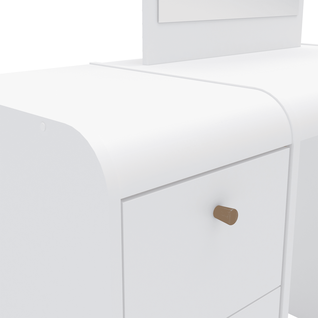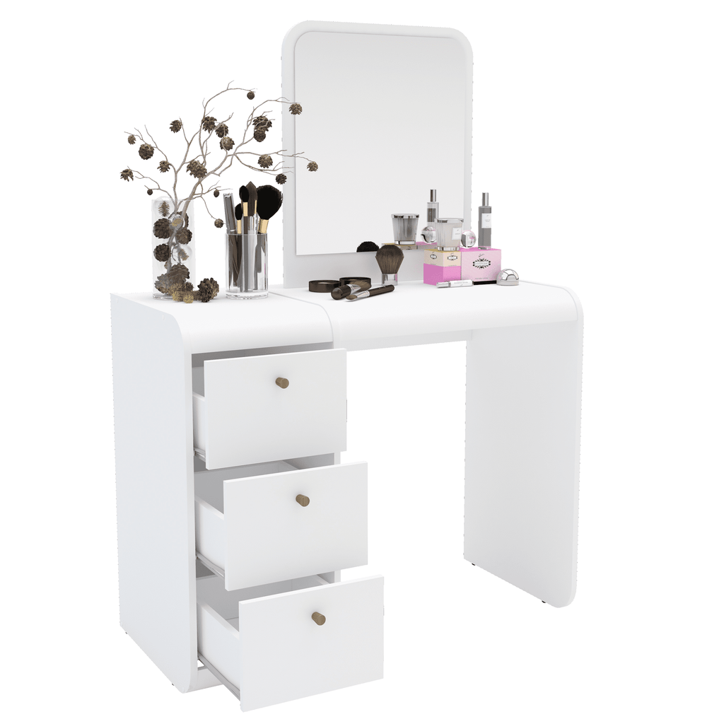 - Shape: Curved shapes makes it a classy vanity and solid construction means it would last well over time, and surely this charming Vanity Table with its modern desing and stunning White Finish would be an ideal gift for your wife, daughter or granddaughter on holidays and other special days.