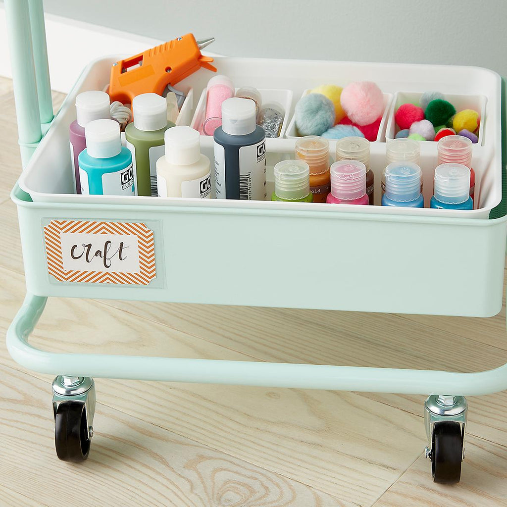 Our Arts & Crafts Storage Cart includes: (1) Mint 3-Tier Rolling Cart, (1) Perch Bitsy Container, (1) Perch Bitsy Organizer, (1) Smart Store Handled Tray, (1) Smart Store 4-Compartment Tray, (1) Small Smart Store Insert, (6) Tall Smart Store Inserts, (1) 4x6 Fuchsia Photo Case, (2) 4x6 Peacock Photo Cases, (2) 4x6 Aqua Photo Cases, (1) 4x6 Orange Photo Case and (1) Set of 12 Smart Store Labels.