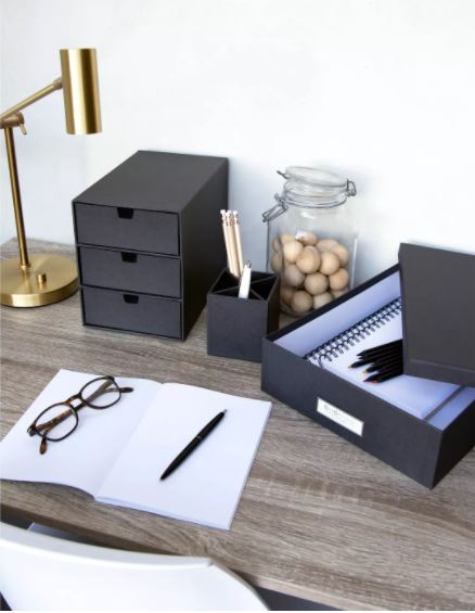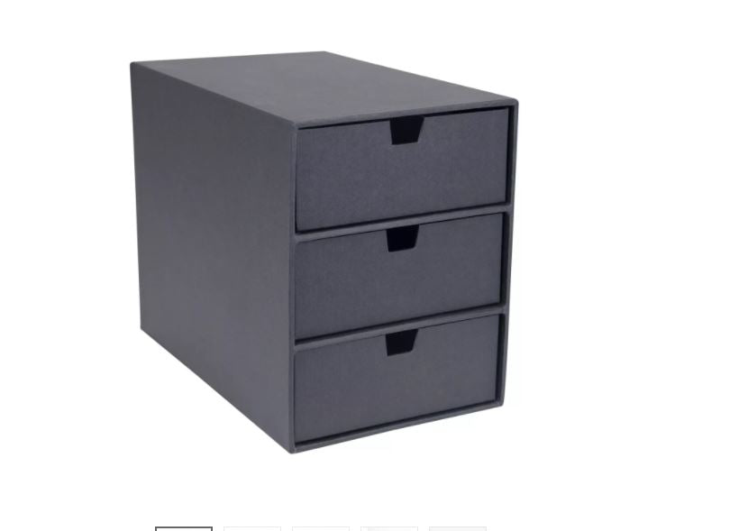 Handy Desktop Organizer with 3 drawers to keep your supplies close at hand. Create a tidy working space with Ingrid. Removable drawers. Coated in textured dark gray paper.