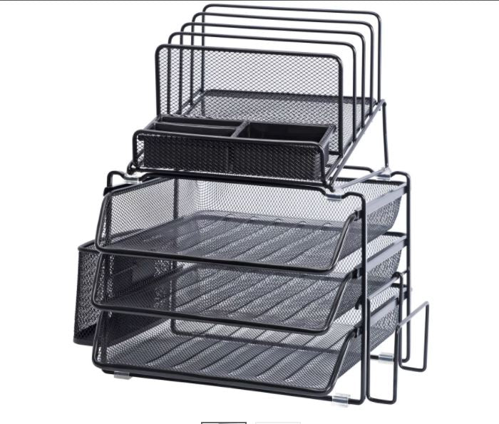 Divided desktop organizer features multiple storage areas to keep a wide variety of your supplies within easy reach. Four-tiered space on top keeps your file folders efficiently organized. Plastic tray offers a handy area to keep paper clips, erasers, notepads and more. Three extra-deep sliding trays provide quick access to your important files and papers. Mesh organizer also features an easy-to-use design to let you quickly assemble it in a flash.
