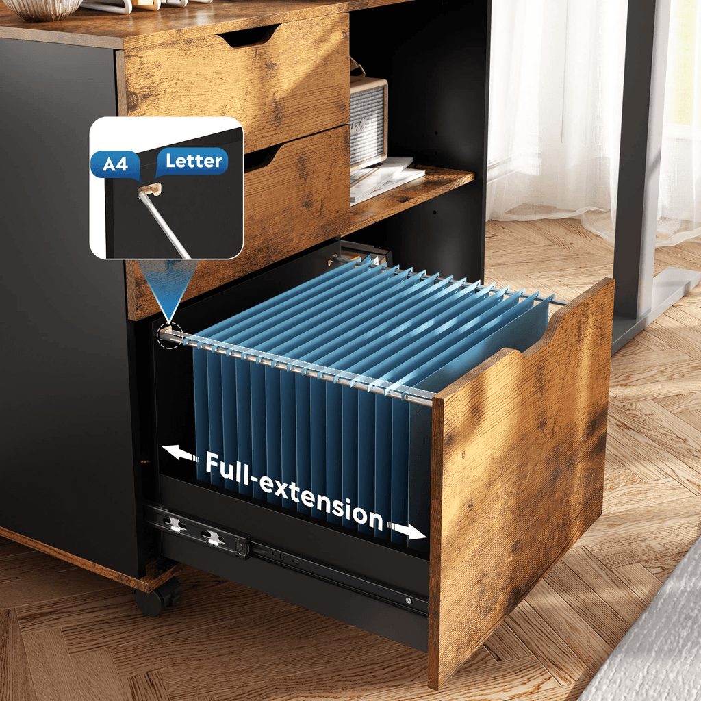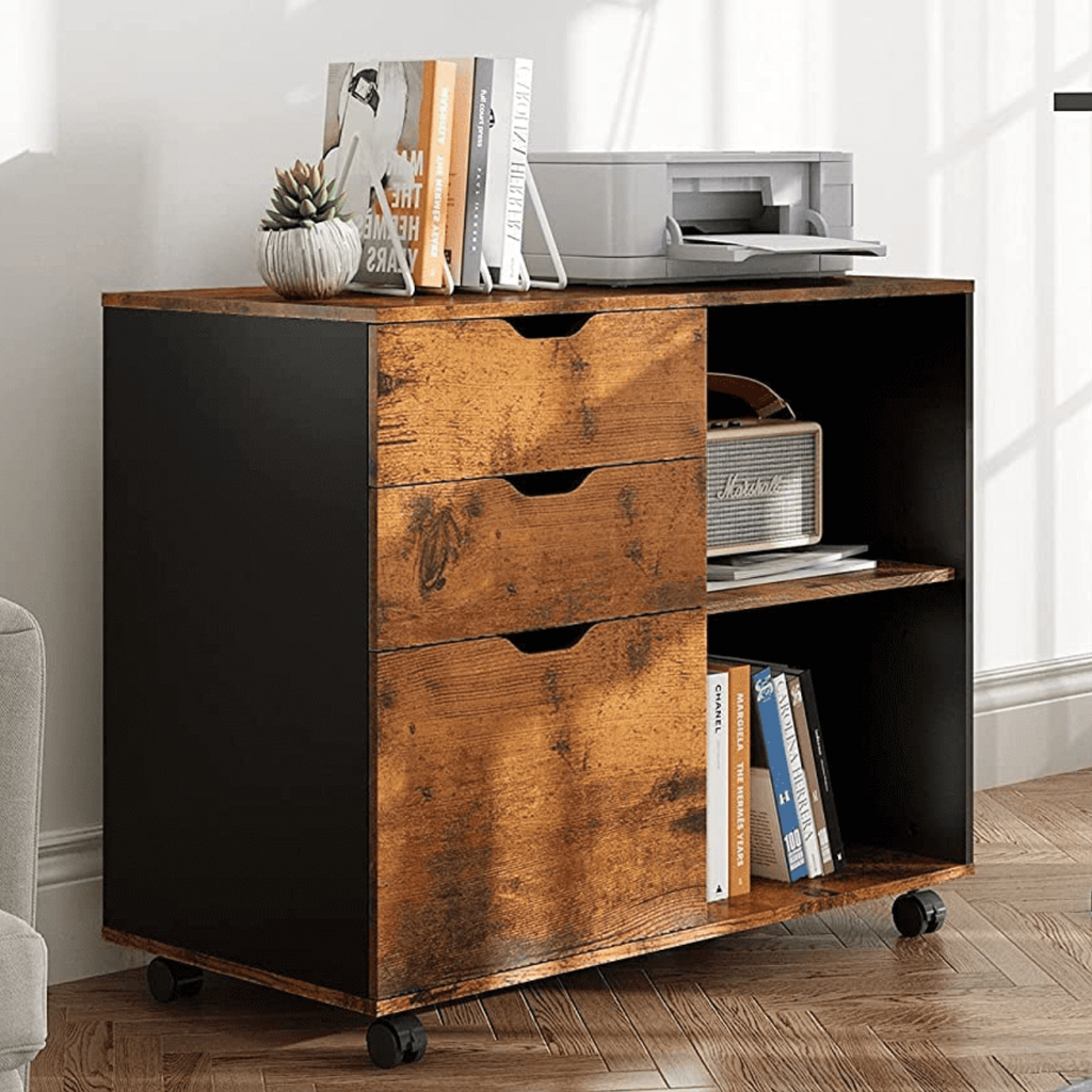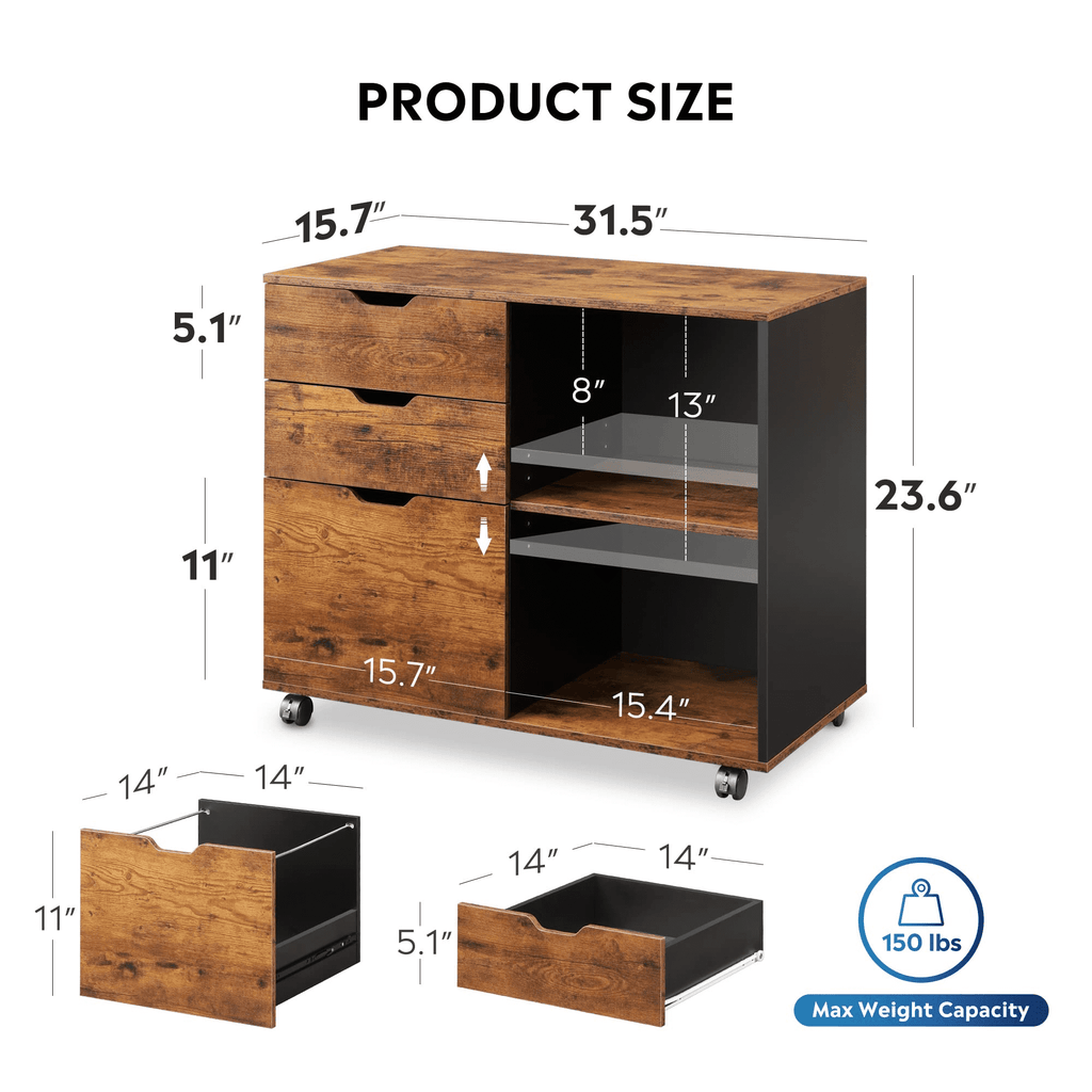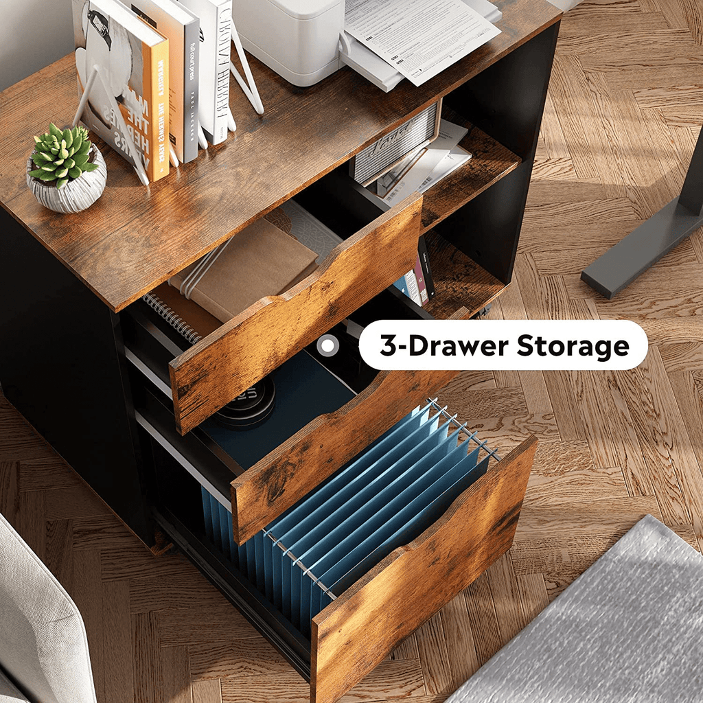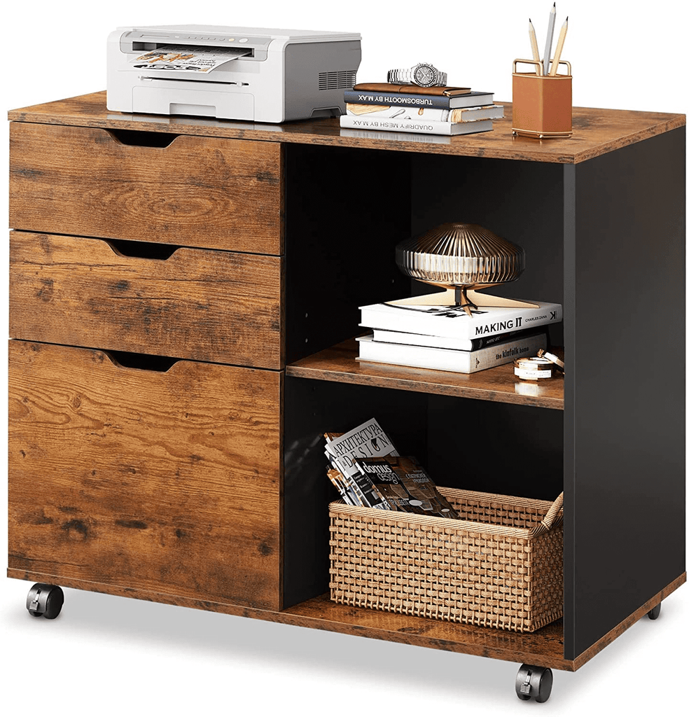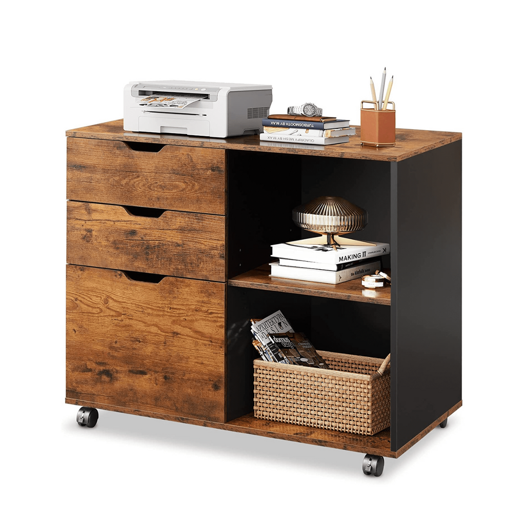 DEVAISE 3-Drawer Wood File Cabinet, Mobile Lateral Filing Cabinet, Printer Stand with Open Storage Shelves for Home Office, Rustic Brown