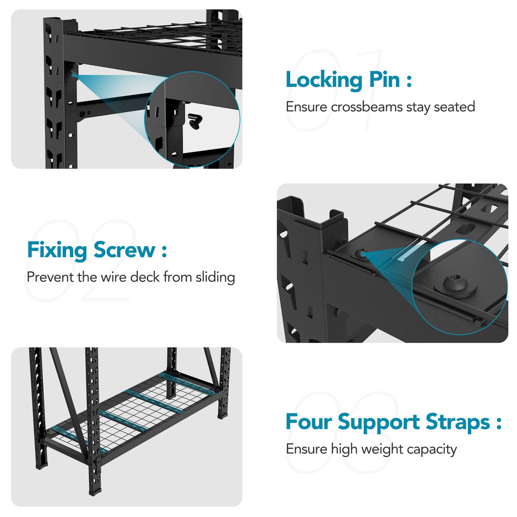 - Safe & Stable : Locking pins ensure crossbeams stay seated and each of the 3 shelves features a total of 4 support straps to prevent twisting or spreading under heavy loads. Moreover, each steel wire deck is fixed by screws to prevent from sliding.