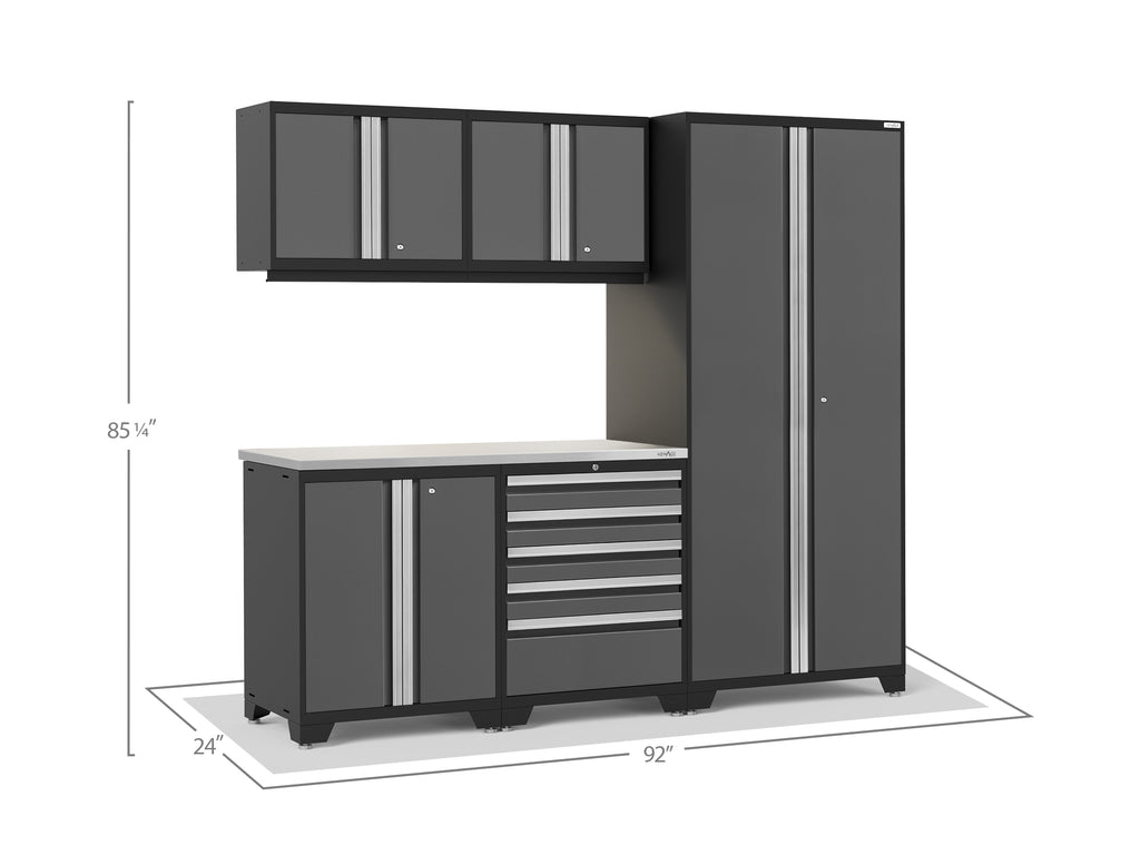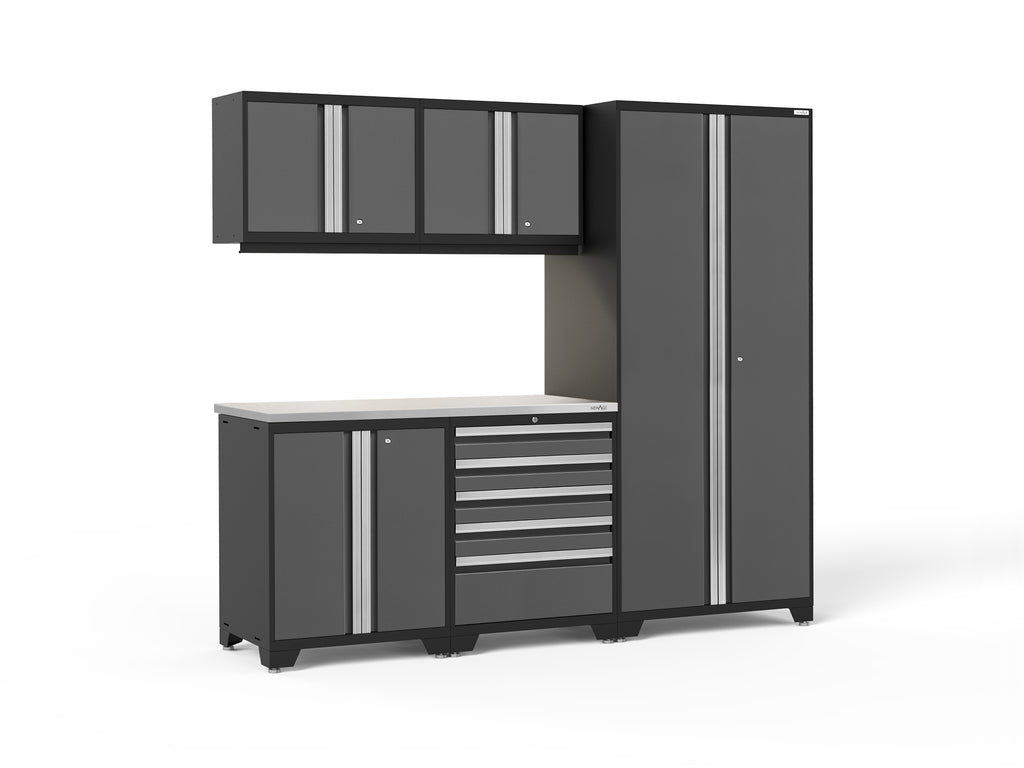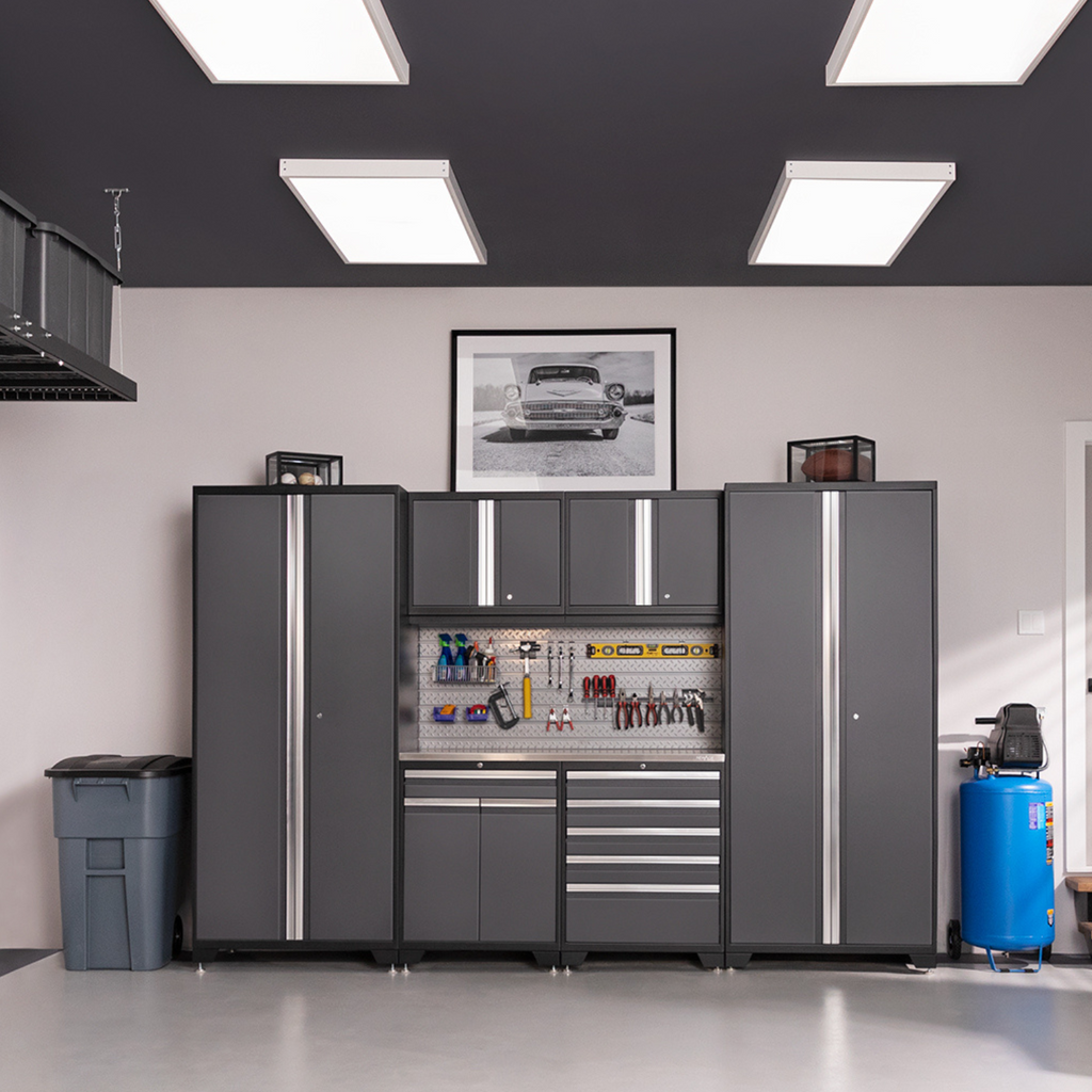 - Your set includes: 1x Multi-Use Lockers, 1x Tool Drawer Cabinets, 1x Two-Door Base Cabinets, 2x Wall Cabinets, 1x 56 in. Stainless Steel Worktops, 1x LED Lights with Power Adapter and 1x LED Lights with Connector Cable
