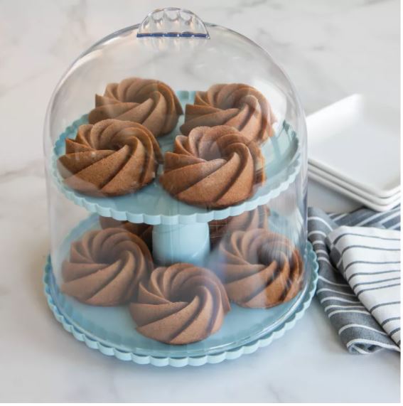 This dessert stand allows you to transport and serve treats with ease. Holds 12 cupcakes or dozens of cookies in a dome-covered 2-tier pedestal to display. Top tier detaches for cleaning or separate display piece. Store and transport desserts with no hassle! Made in the USA.