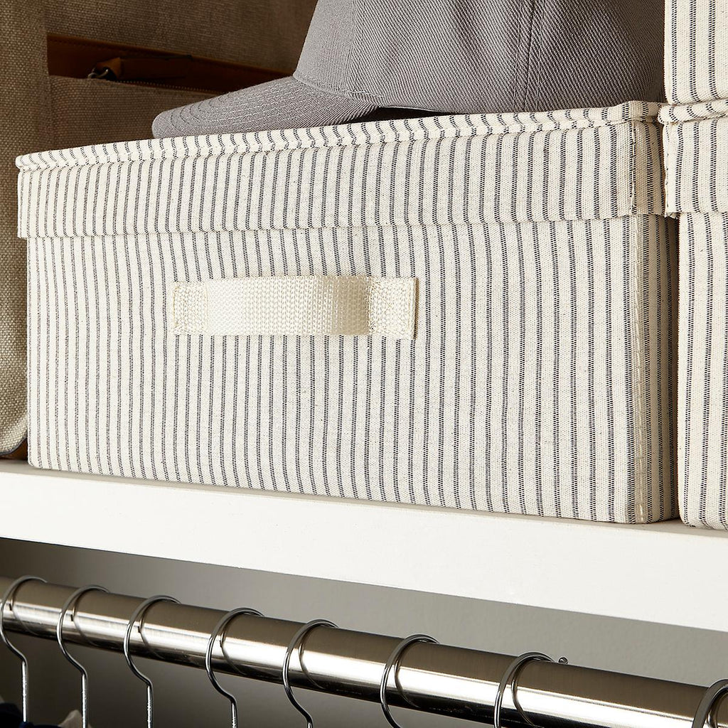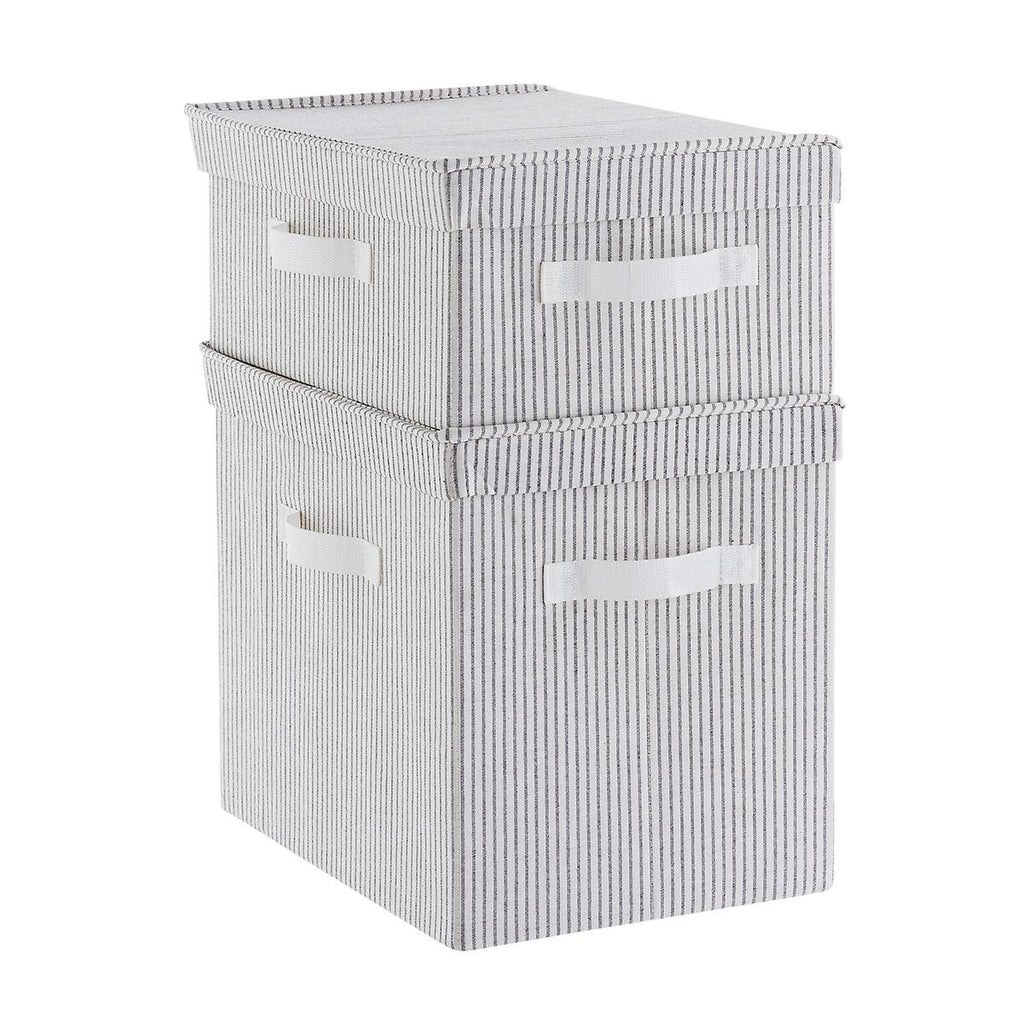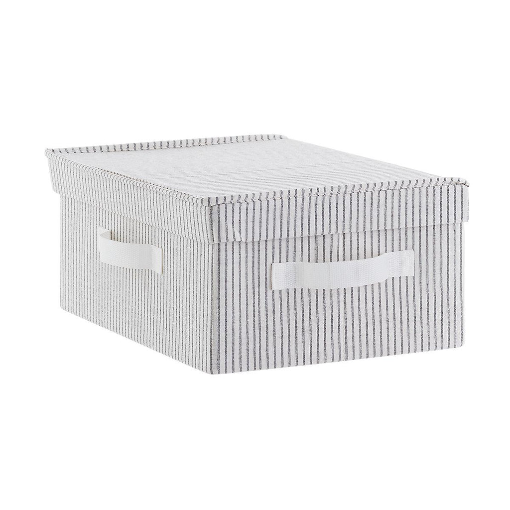 Covered in a vintage-inspired cottage stripe, our Farmhouse Storage Box is a fresh way to organize linens, blankets, accessories and more. A hinged lid provides wide access, closes snug and keeps contents dust-free. Inside, a soft fabric lining is gentle on garments and throws. Easy-carry exterior handles make everything simple to grab and move. Perfect for seasonal storage, or for adding rustic charm when set out in the open, each box folds completely flat when not in use.
