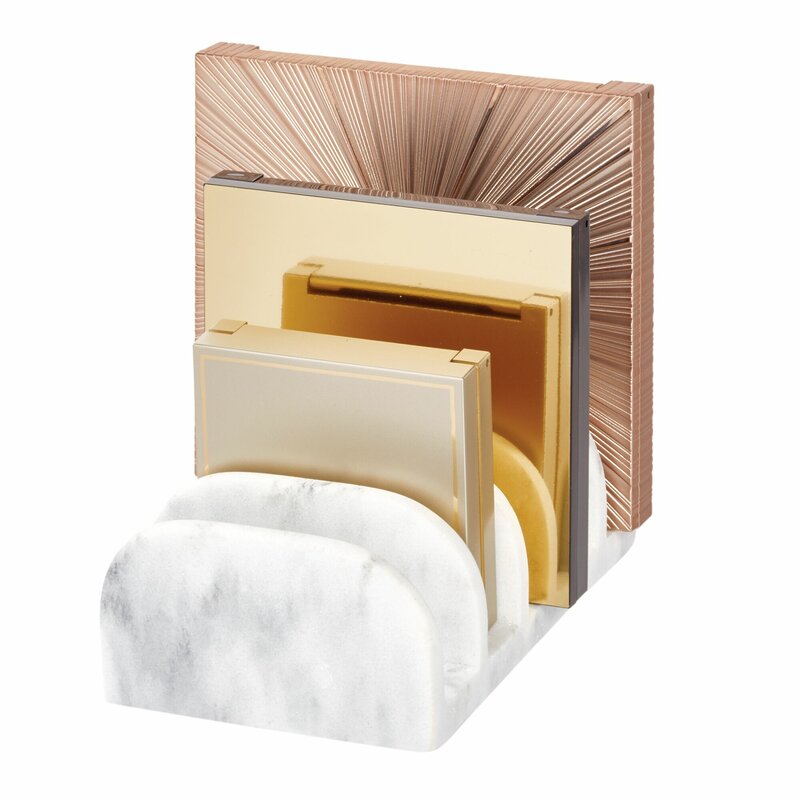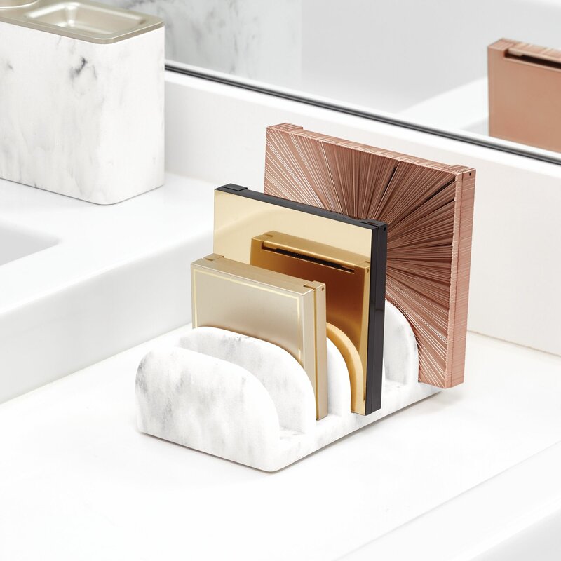 organizer. Designed with style and function in mind, this bathroom vanity and countertop organizer features five divided compartments to store and organize eyeshadow, contour, powder, or lipstick palettes of any length. This versatile organizer can also be used in the office, closet, bedroom, or wherever you need additional organization. The open design and raised sides to ensure that the contents stay upright and are always visible and accessible. This countertop organizer is designed with an on-trend white and gray marble finish that matches a variety of home and bathroom decor styles.