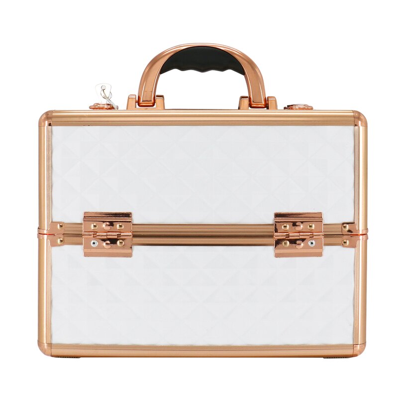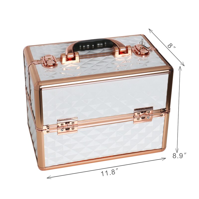 Makeup train case with 2 keys and 4 adjustable trays, free-standing workstation allows you to keep your makeup accessories neat and organized. A comfortable rose gold handle matches with the whole case makes it more impressive. Durable aluminum frame protectors and metal corners for dual sturdiness. 2 Keys ensure extra safety, also protect your privacy. It is a professional makeup case with large storage space, a perfect choice to organize all your cosmetics for daily or long-distance traveling use.