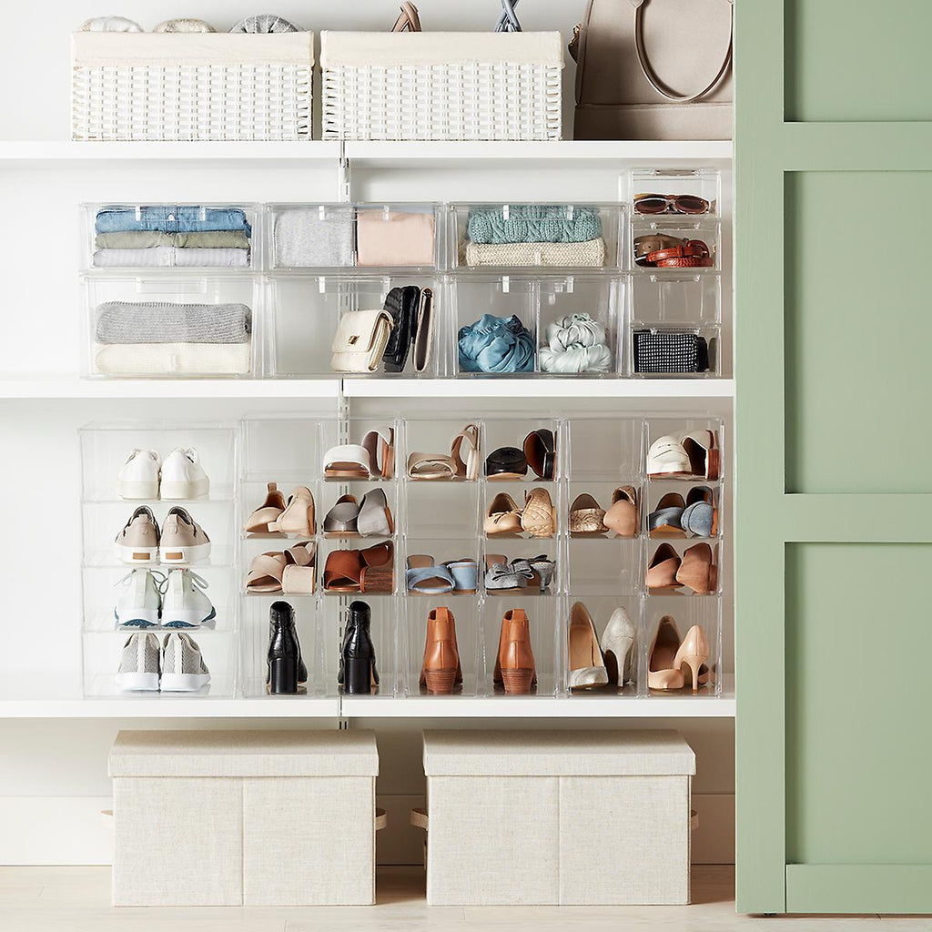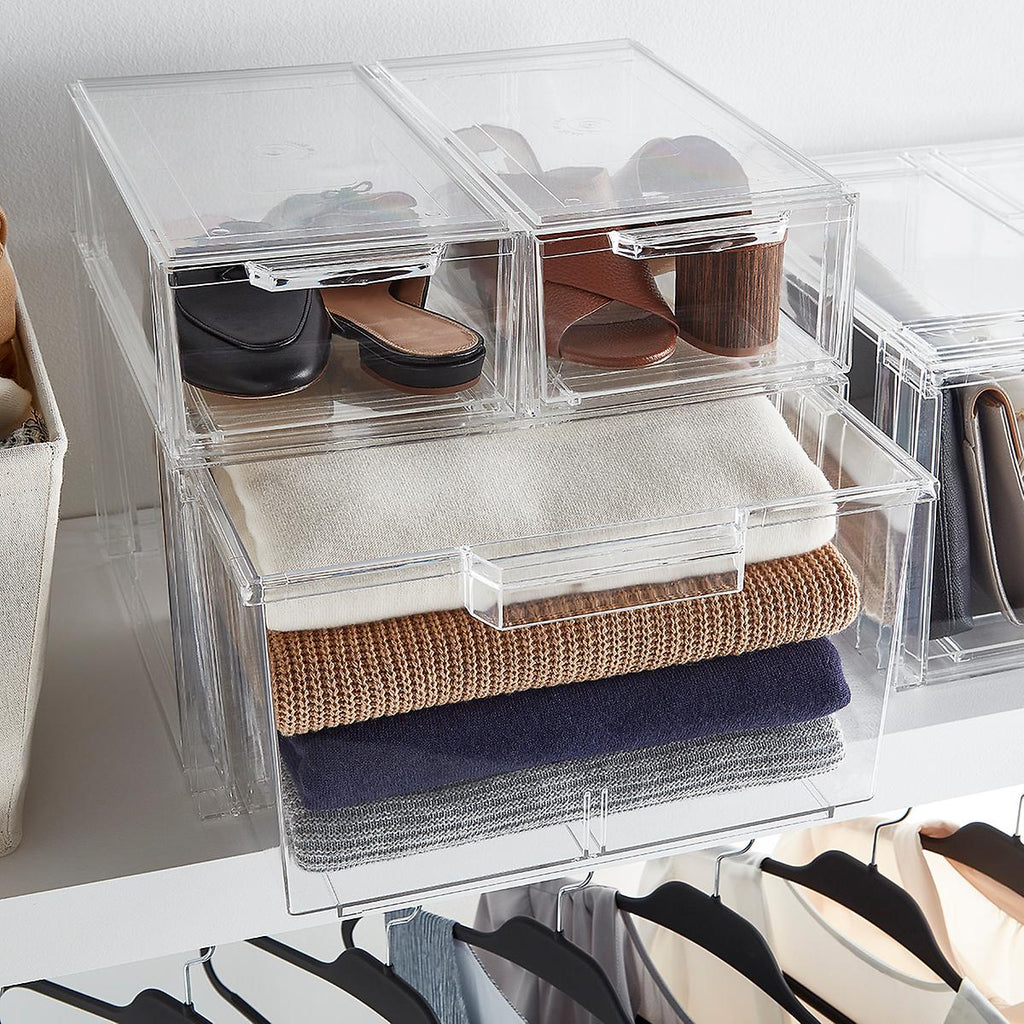 Our Clear Stackable Large Shoe Drawer provide visible accessibility for closet organization. Sized for shoes, the drawers can also accommodate other items as well - scarves, socks, lingerie and accessories. Specially designed to stack securely, they serve as a great storage option for crafts, office supplies, toys and toiletries. When stacking the drawers side-by-side, 4 Shoe Drawers = 3 Large Shoe Drawers = 3 Shirt & Accessory Drawers = 2 Sweaters Drawers.