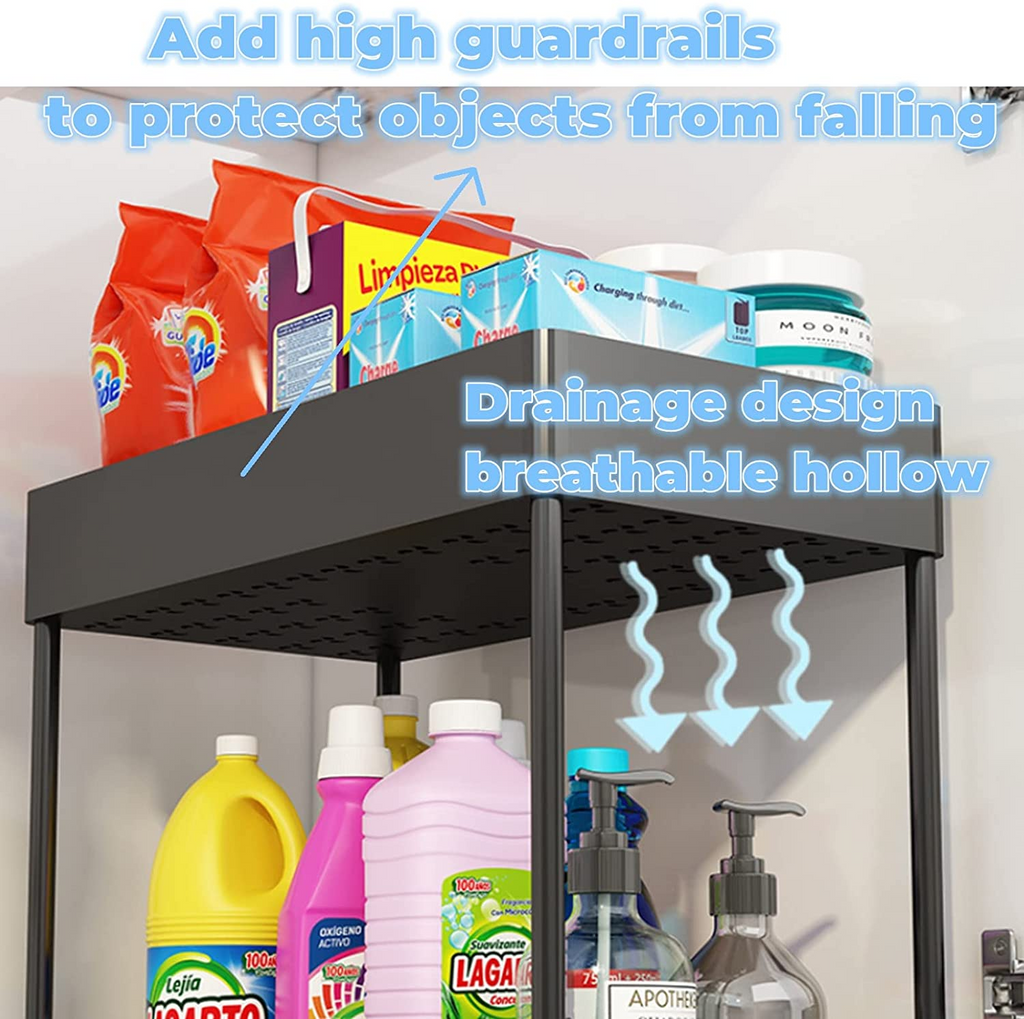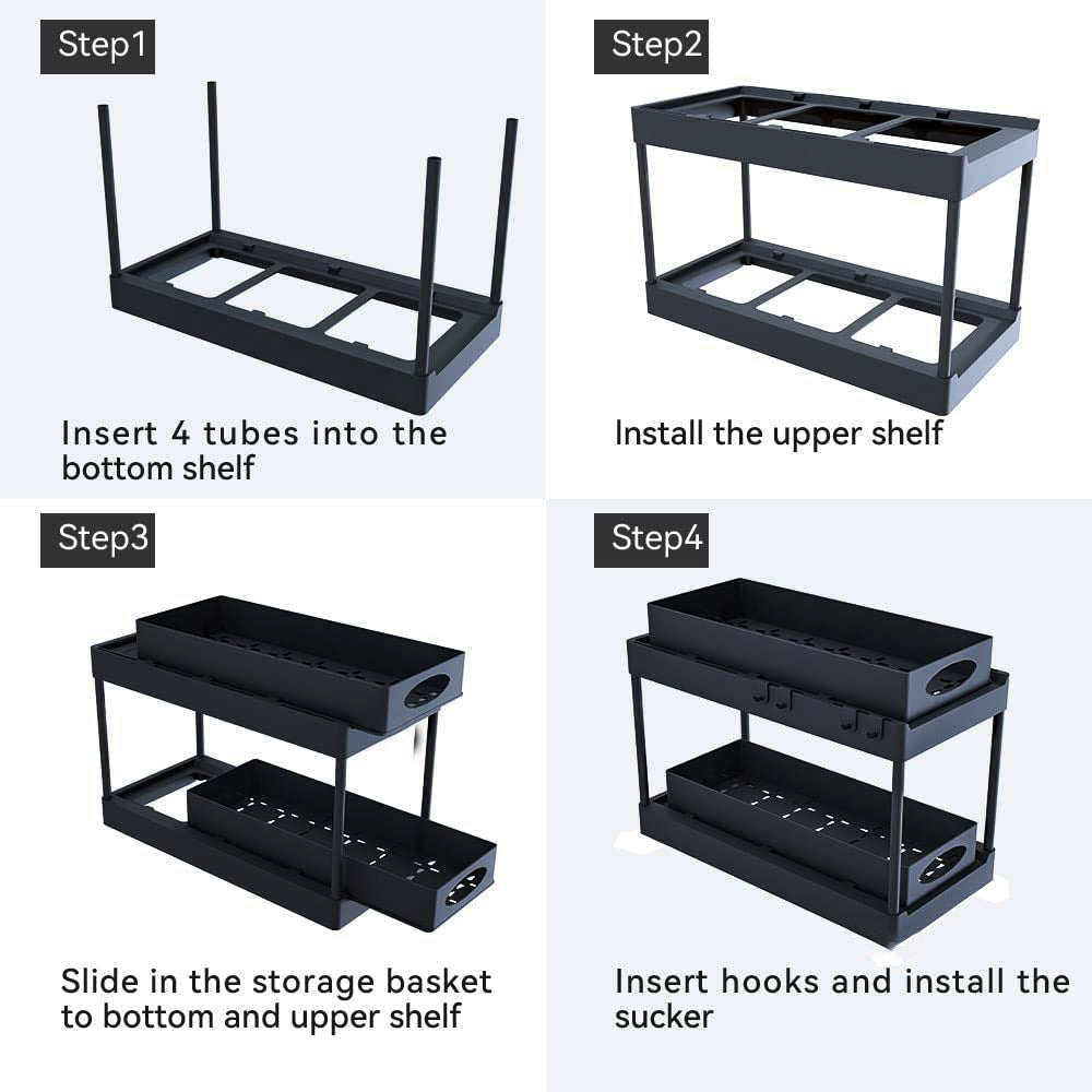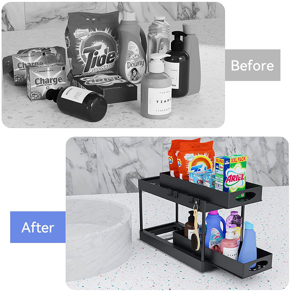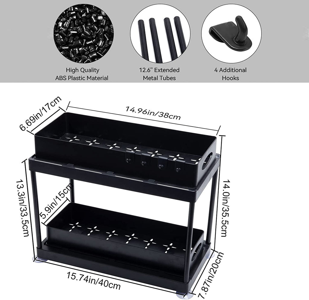 Unlike the others, our under sink organizer features 2 slide-out drawers, the upper and lower baskets both can slide freely along the track. The sliding drawers with a handle for easy access in limited space. It is more convenient for storing and taking out your favorite supplies. Great for organizing to increase extra storage space in the under sinks, bathrooms, kitchens, food pantries, offices, and other places. This under-cabinet storage makes your bathroom toiletries and kitchen spice bottles stored in an orderly manner. This under-bathroom sink organizer is made of high-quality ABS plastic material. The four metal support tubes with a black protective coating, rust-proof and strong support. Features with sturdy structure, it will not tip over or fall or shake. Comes with 4 movable hooks for hanging small items.