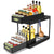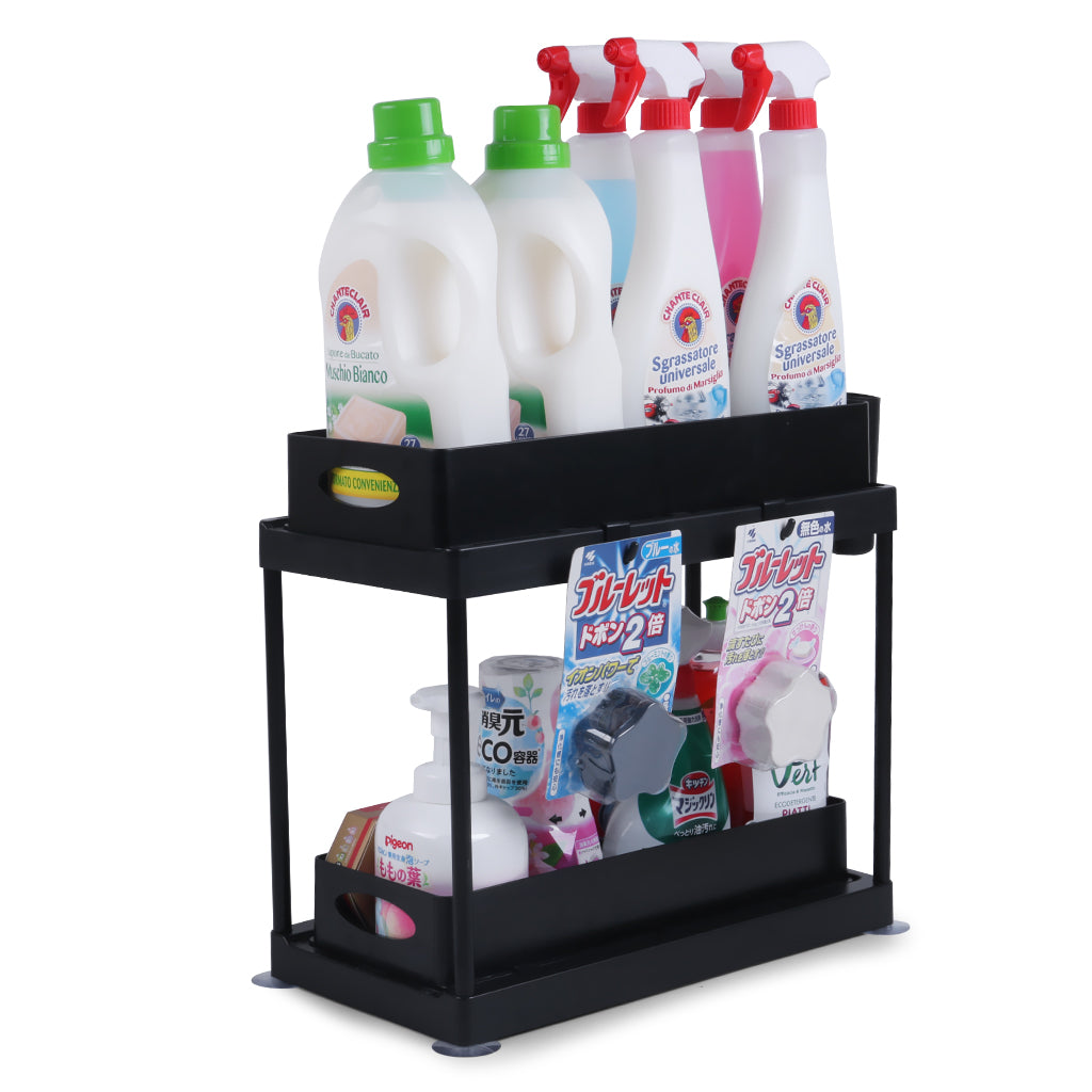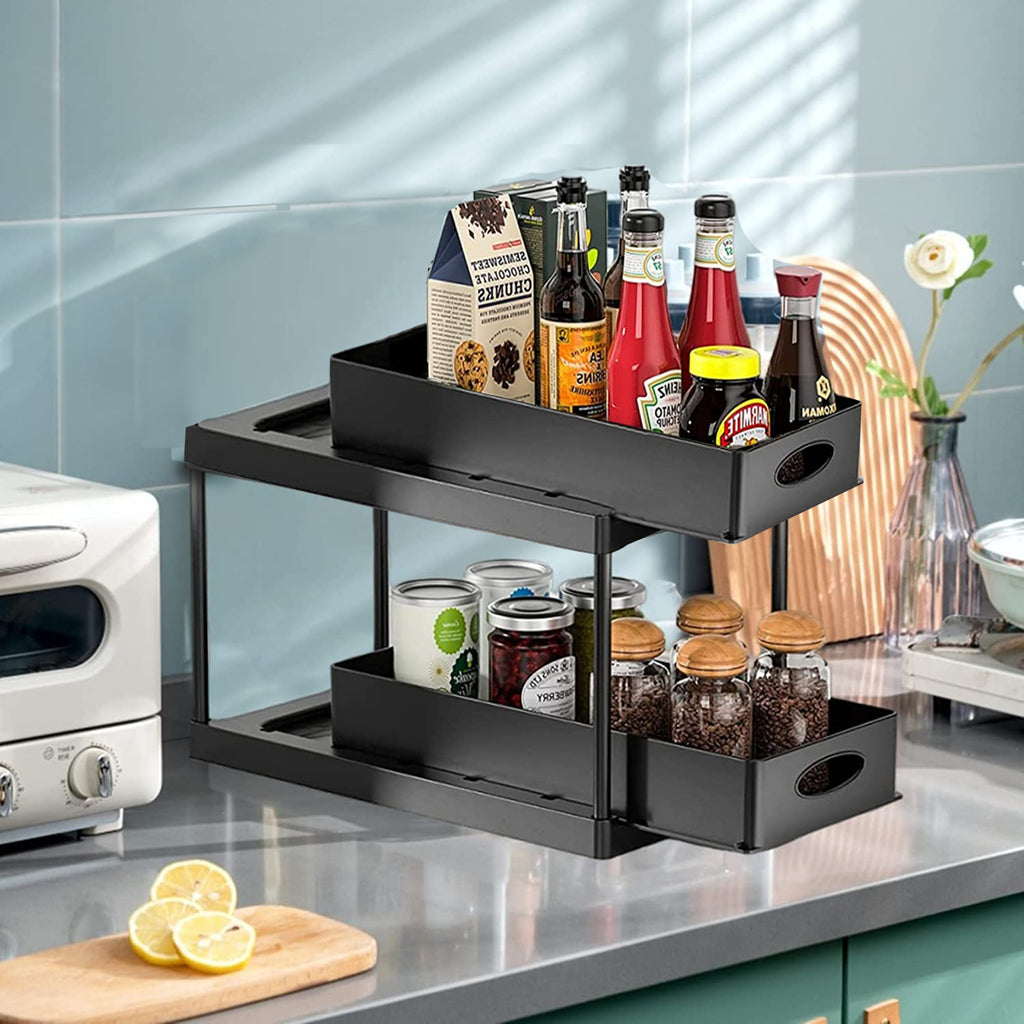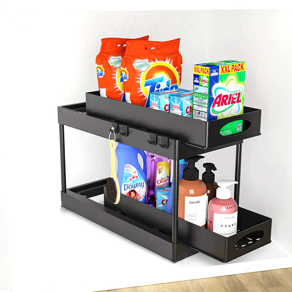 Unlike the others, our under sink organizer features 2 slide-out drawers, the upper and lower baskets both can slide freely along the track. The sliding drawers with a handle for easy access in limited space. It is more convenient for storing and taking out your favorite supplies. Great for organizing to increase extra storage space in the under sinks, bathrooms, kitchens, food pantries, offices, and other places. This under-cabinet storage makes your bathroom toiletries and kitchen spice bottles stored in an orderly manner. This under-bathroom sink organizer is made of high-quality ABS plastic material. The four metal support tubes with a black protective coating, rust-proof and strong support. Features with sturdy structure, it will not tip over or fall or shake. Comes with 4 movable hooks for hanging small items.