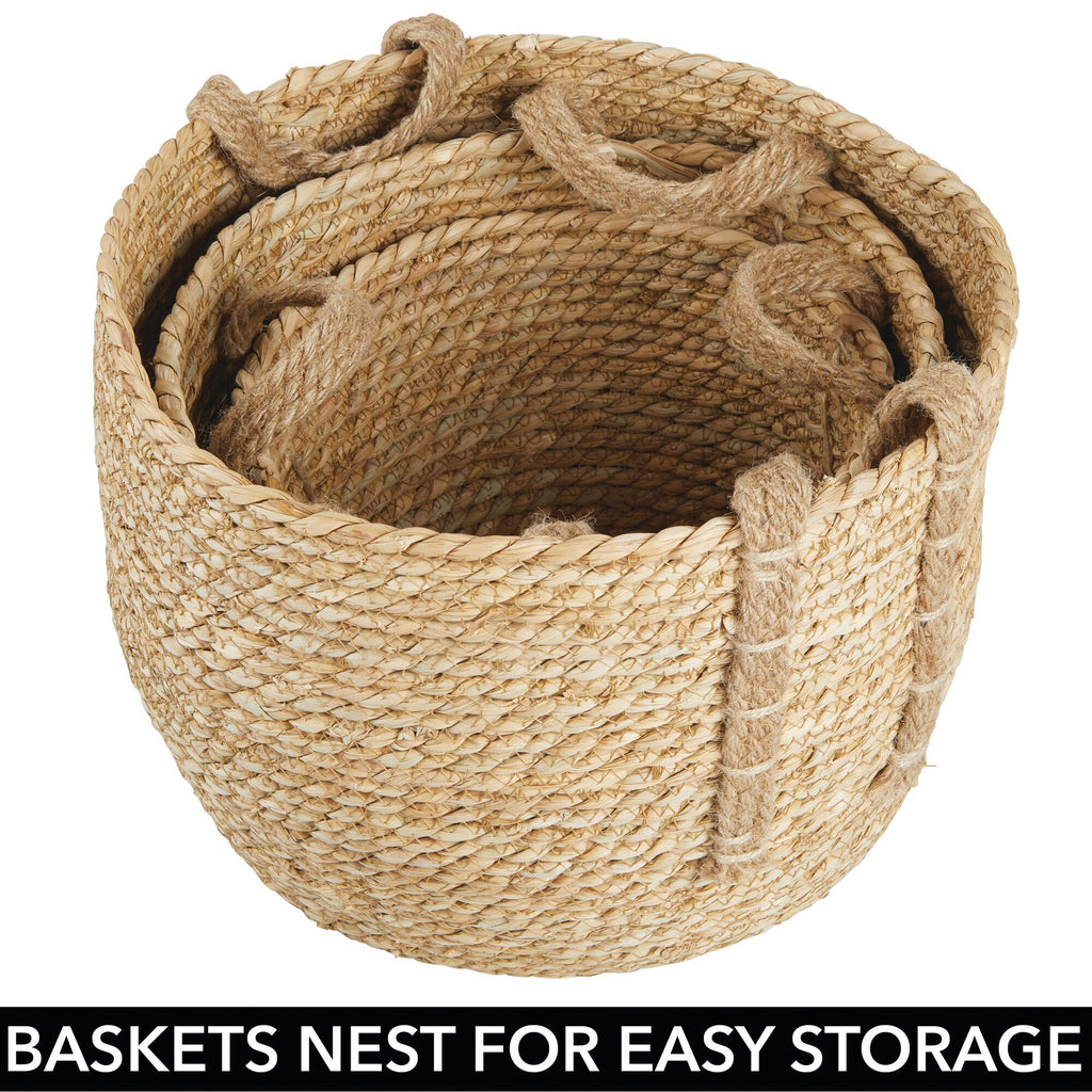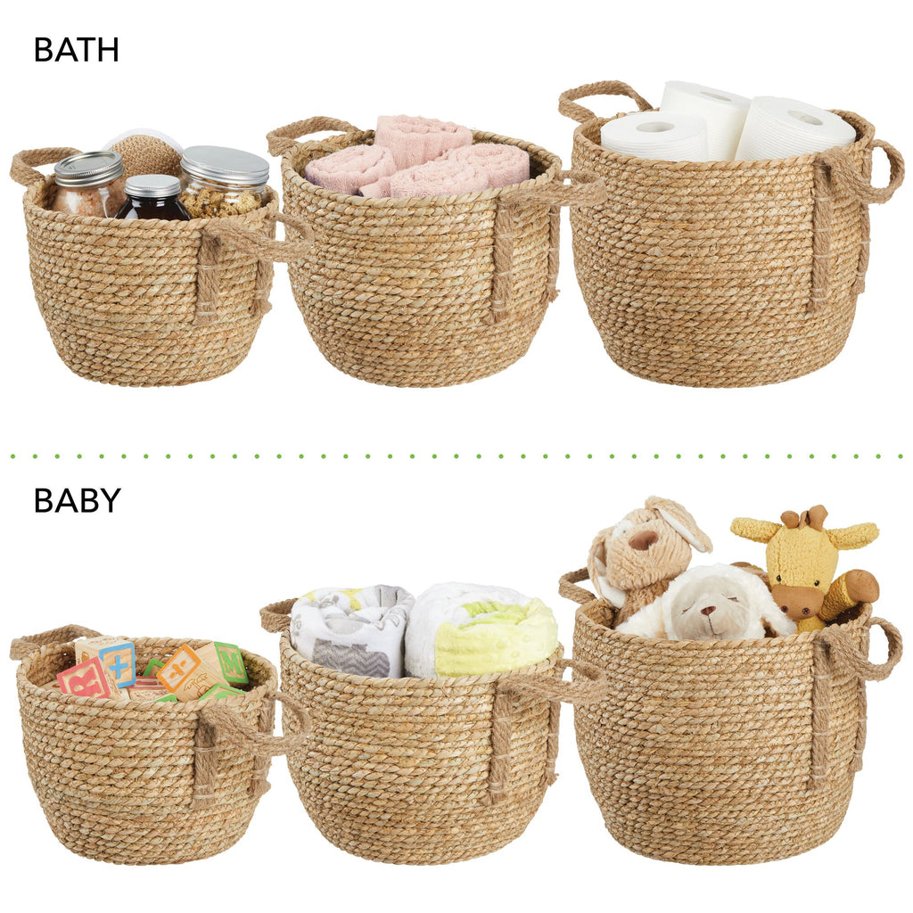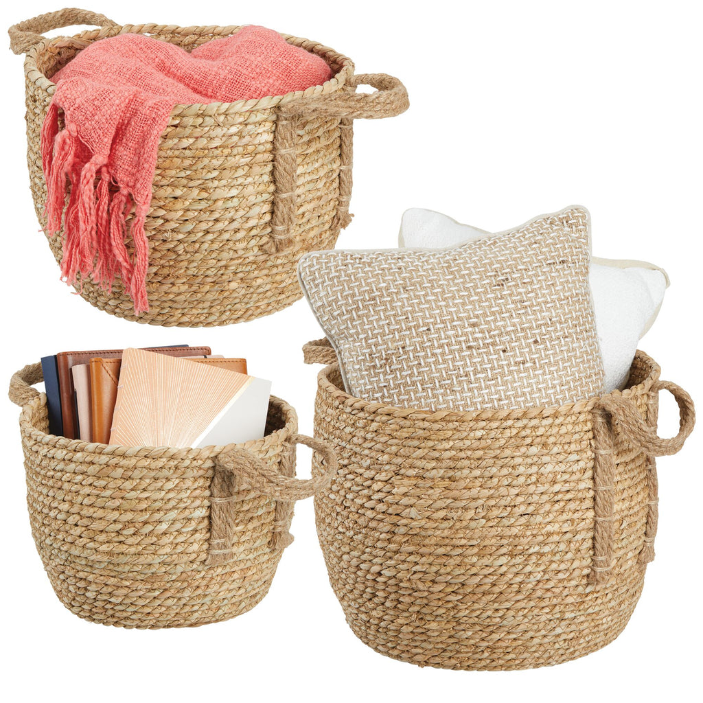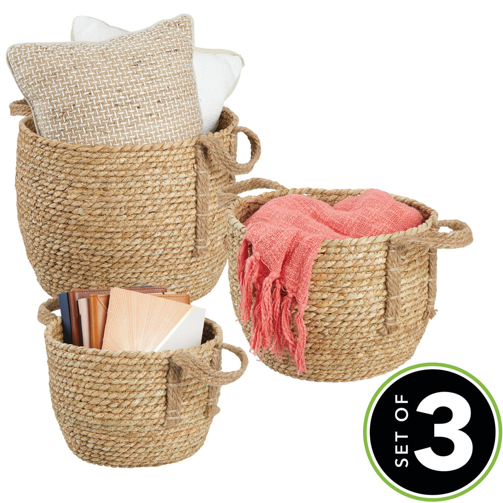 - PORTABLE: These woven baskets for storage have integrated jute rope handles making them easy to pull on and off of shelves; Use together or separately for coordinated storage throughout the home