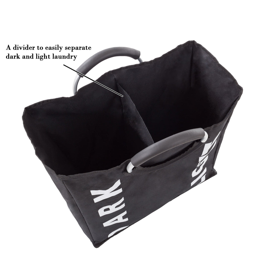 - EASILY SEPARATE AND ORGANIZE LAUNDRY - Save time by sorting your dark and light clothes before laundry day. The double compartment hamper features a divider between the two baskets which makes separating and organizing all of your laundry by color hassle free!