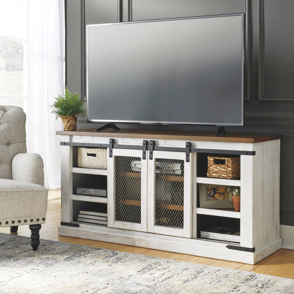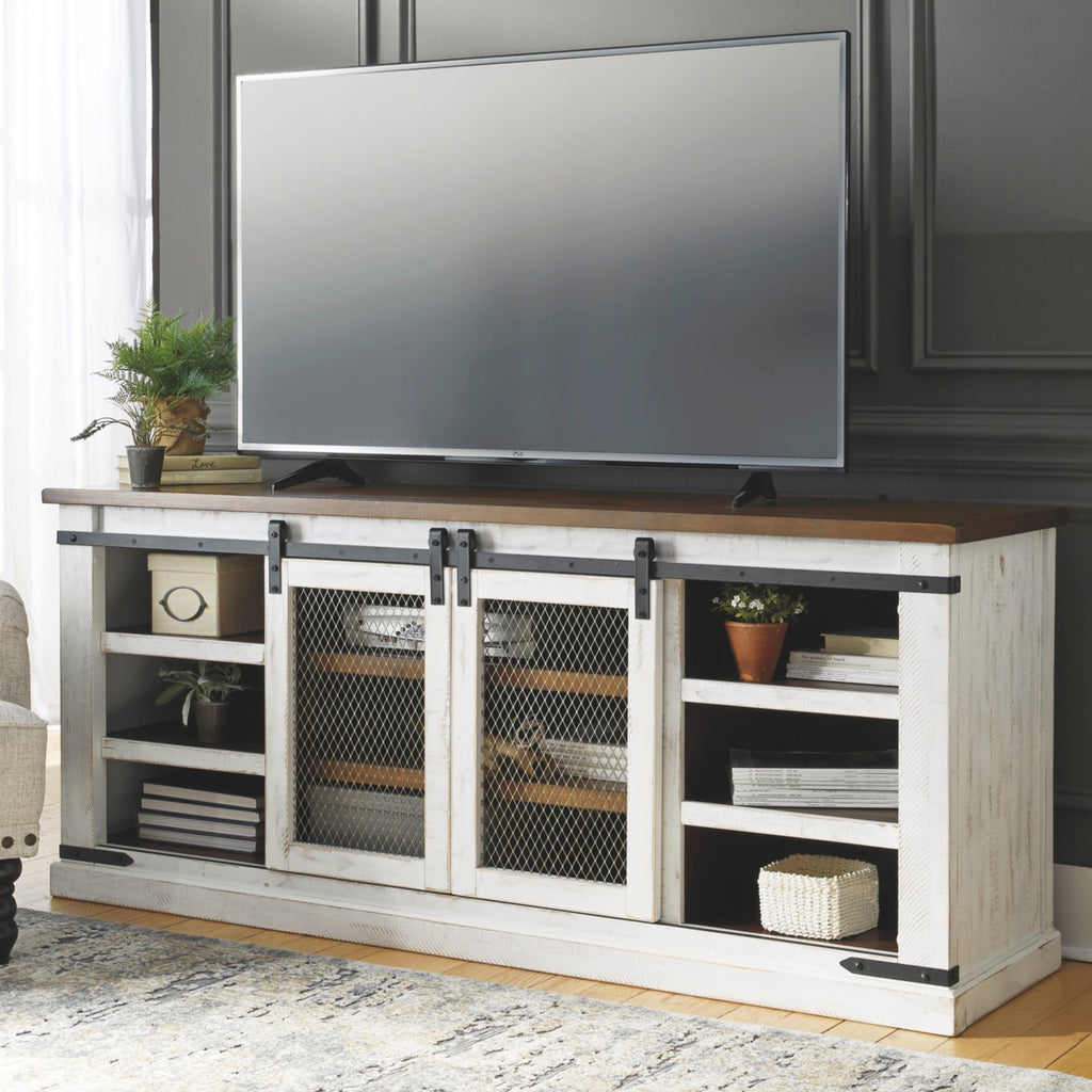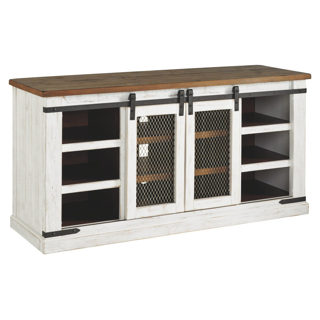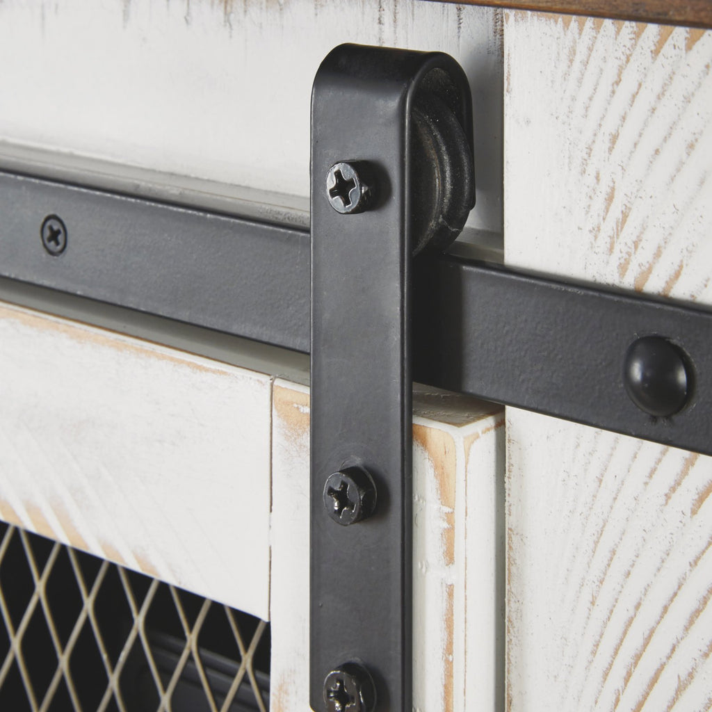 Complete your farm-inspired living space with the Signature Design by Ashley Wystfield 2 Door TV Stand. This stand features a two-tone finish with weathered, industrial hardware for a completely coordinated, rustic vibe. Double sliding doors with mesh screens are the finishing touch for this eye-catching piece. Store all your electronic consoles and home media accessories on the three tiers of spacious shelving. Choose from the available size options to suit your TV screen needs.